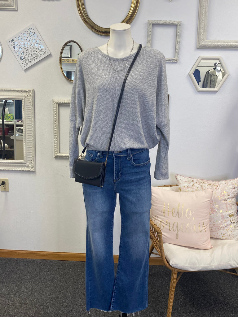 Color: Heather GreyFit: Relaxed body, dolman sleeve and fitted at bottom hemFeel: Soft brushed waffle knit textureFabric: 78% Rayon, 21% Polyester, 3% Spandex